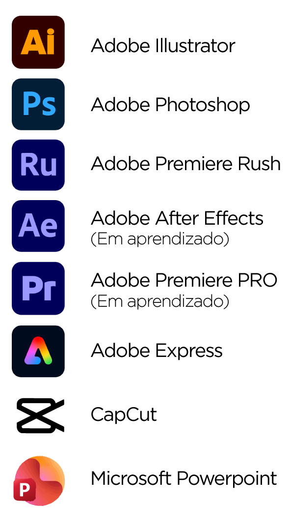 Utilizo ferramentas profissionais de design e edição que fazem parte do meu processo criativo. Esses softwares me permitem desenvolver projetos com qualidade técnica, precisão e eficiência, desde a criação visual até a finalização de materiais para diferentes plataformas.